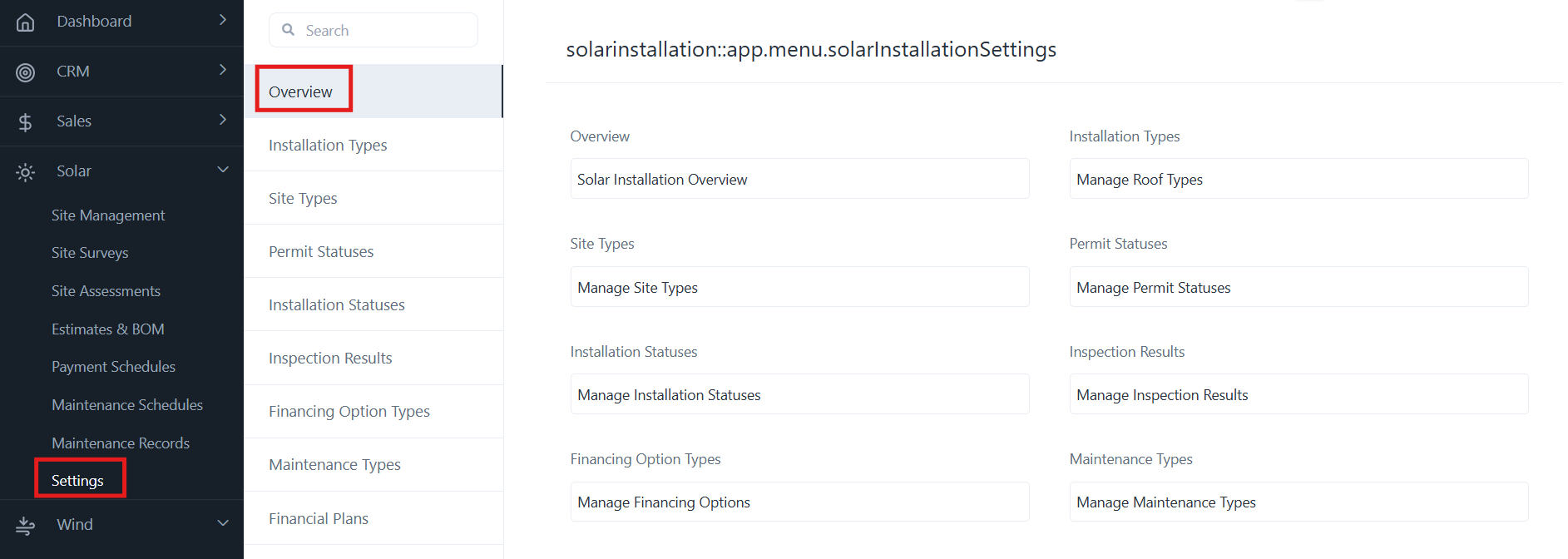 The Settings sub-module in the Solar CRM provides administrators with the ability to configure system-wide parameters for solar project management. By customizing site types, installation statuses, maintenance types, financing options, and inspection results, businesses can align the platform with their operational processes.