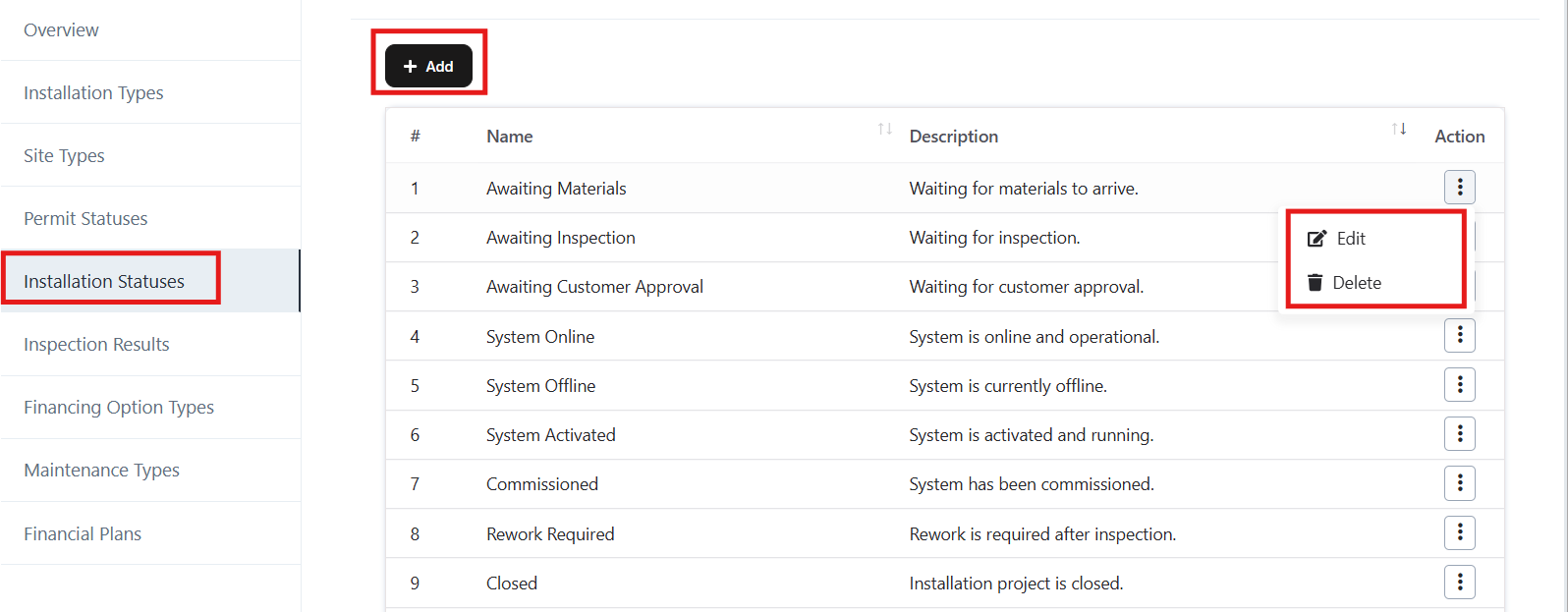 The Installation Statuses module allows you to create, edit, and delete different statuses for installation projects. These statuses help track project progress effectively.