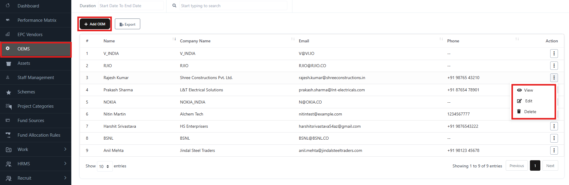 - Click on the Export button to download the list of OEMs in an external file (e.g., Excel/CSV).