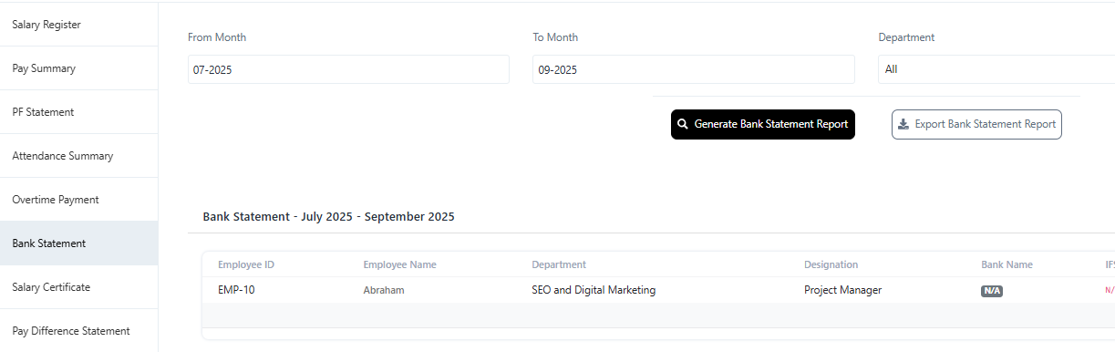Navigate to the left side of Payroll Report → click on Bank Statement → click on Export Bank Statement Report
