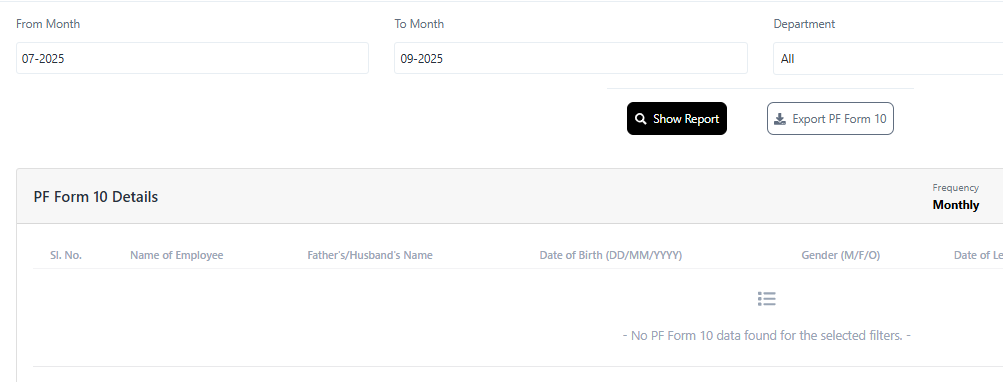 Navigate to the left side of Statutory Filings & Returns → click on PF Form 10 → click on Export PF Form 10