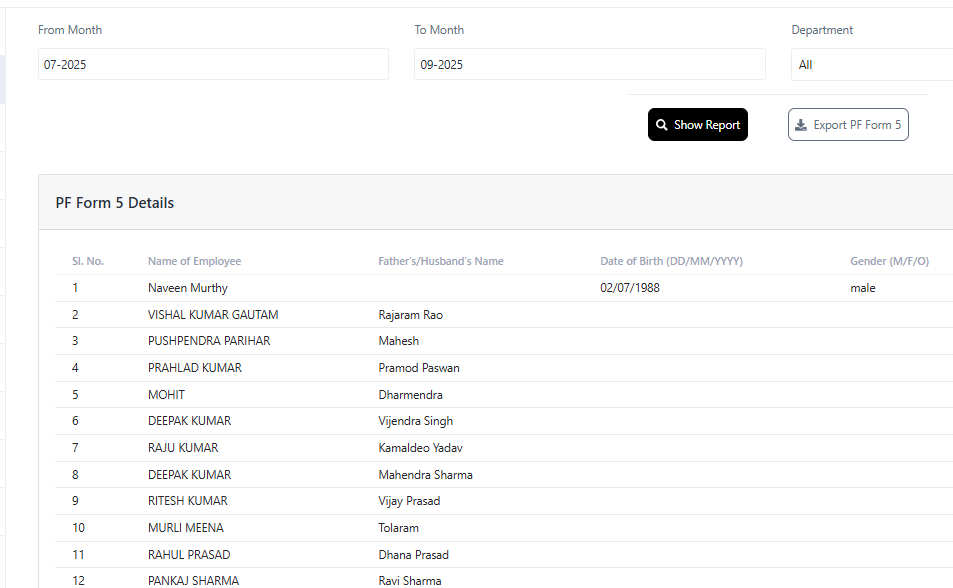 Navigate to the left side of Statutory Filings & Returns → click on PF Form 5 → click on Export PF Form 5