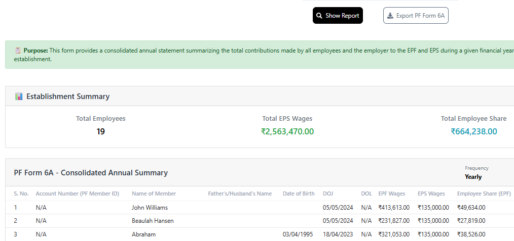 Navigate to the left side of Statutory Filings & Returns → click on PF Form 6A (Annual) → click on Export PF Form 6A