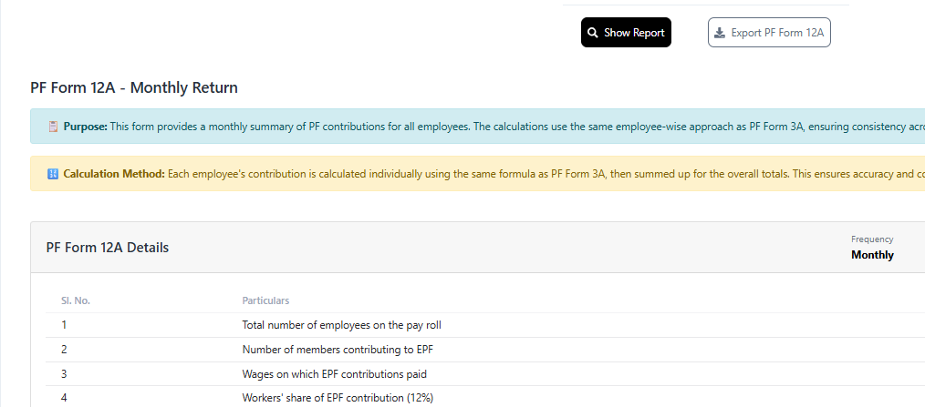Navigate to the left side of Statutory Filings & Returns → click on PF Form 12A → click on Export PF Form 12A