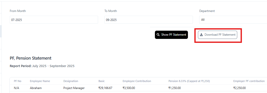 Navigate to the left side of Payroll Report → click on PF Statement → click on Download PF Statement