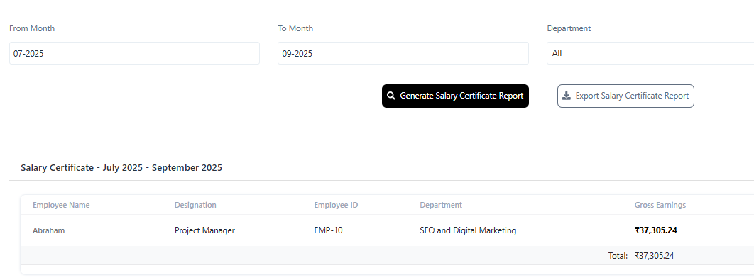 Navigate to the left side of Payroll Report → click on Salary Certificate → click on Export Salary Certificate Report