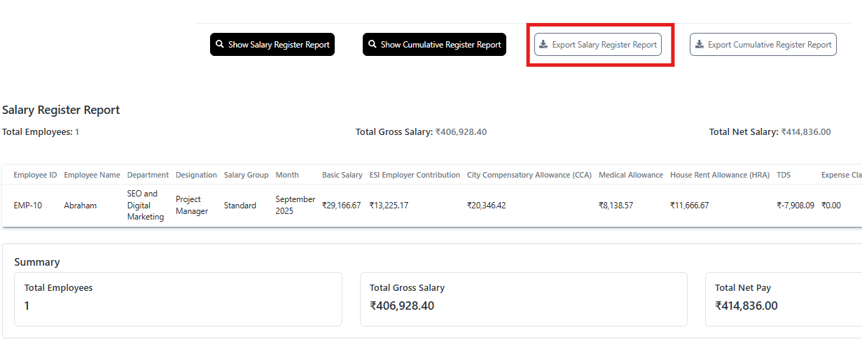 Navigate to the left side of Payroll Report → click on Salary Register → click on Export Salary Register Report