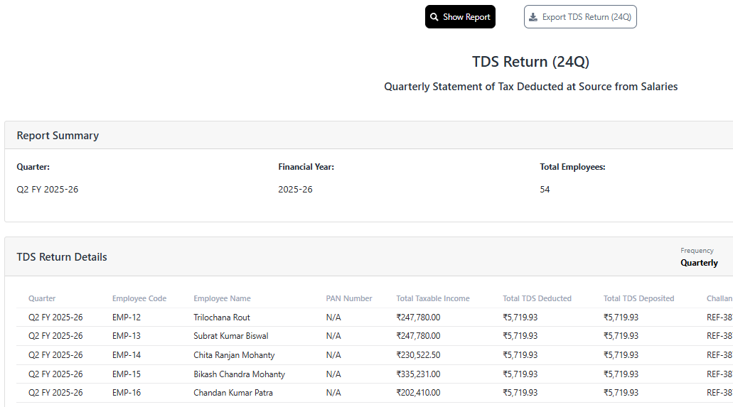 Navigate to the left side of Statutory Filings & Returns → click on TDS Return (24Q) → click on Export TDS Return (24Q)