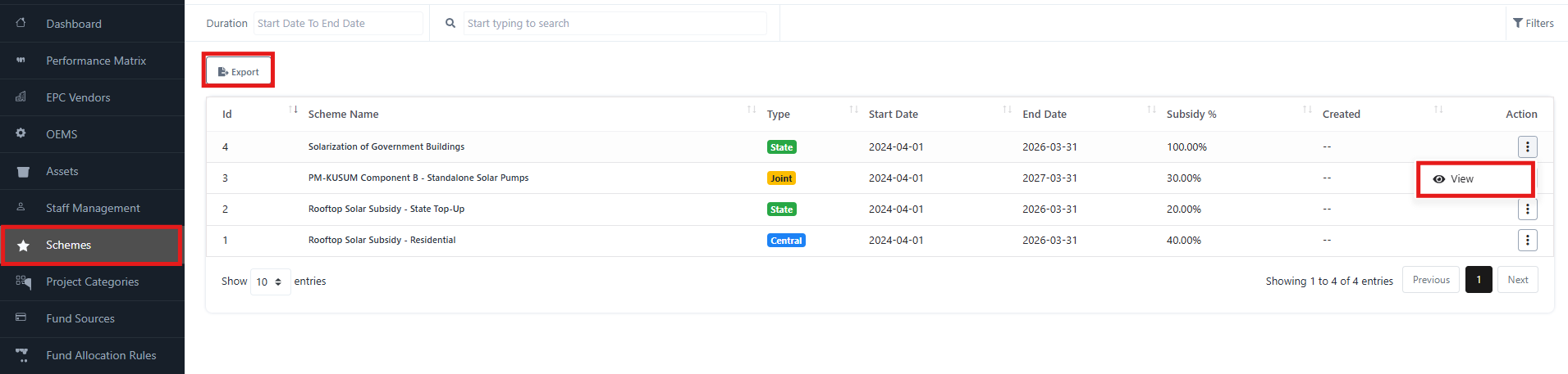 The Schemes module allows administrators to manage solar subsidy and funding schemes. It provides details on scheme type, duration, subsidy percentage, and offers quick access to view scheme information.