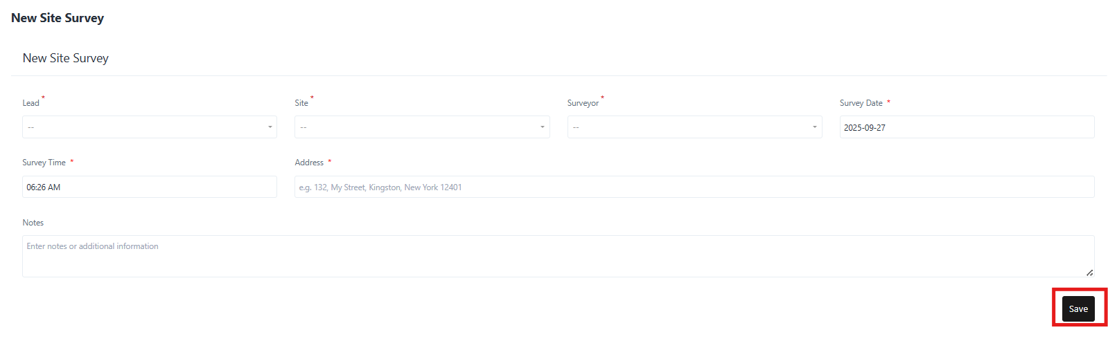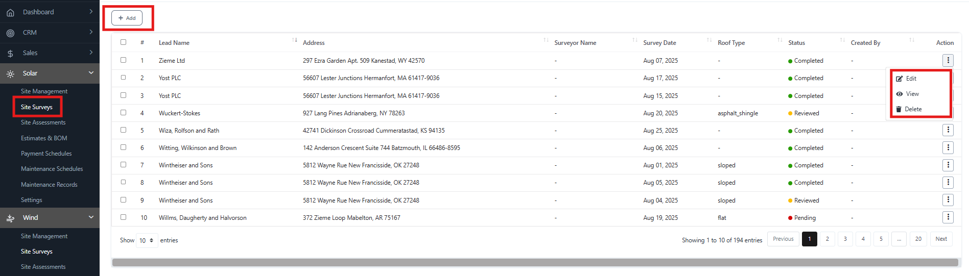 Login ➜ Solar ➜ Site Surveys ➜ Add / Edit / View / Delete Survey