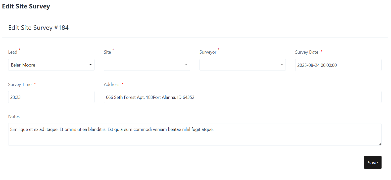 - A detailed read-only page displays all survey information, including lead, site, roof type, and survey status.