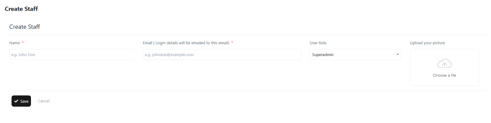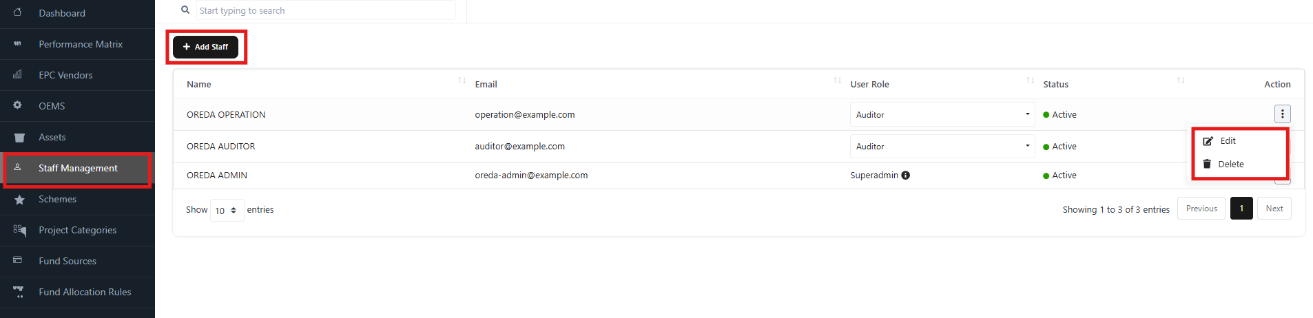 The Staff Management page displays a list of all staff users in the system, along with details such as: